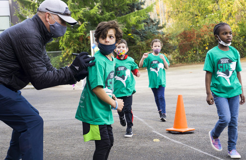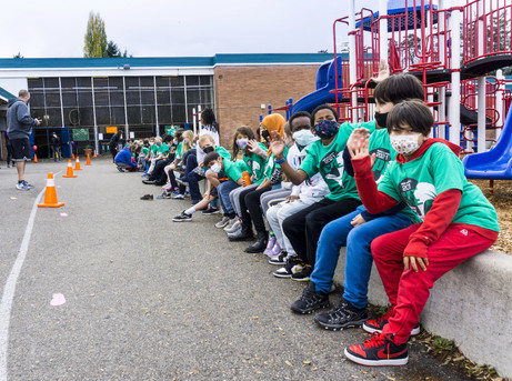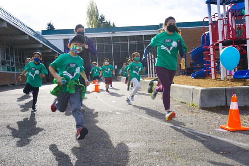 What fun it was to be back running on our playground again this year! On a classic November day threatening rain, we enjoyed sun breaks from the beginning and our final group finished right before it opened up again. Full of excitement and looking confident in their Move-A-Thon t-shirts, our little squirrels put up an amazing effort. All together they ran, jogged, walked and rolled for 1,805 laps! That is a lot of tally marks to make. Thanks so much to parents, family members, teachers and staff who showed up to volunteer, mark shirts, and cheer on our squirrels. Loved seeing classrooms of squirrels lining up with signs to cheer on one another, too. Our wonderful community members who couldn't be there in person were definitely there in spirit, because the entire Squirrel Squad stepped up this year and exceeded our fundraising goals by a wide margin! Standing ovation to all!